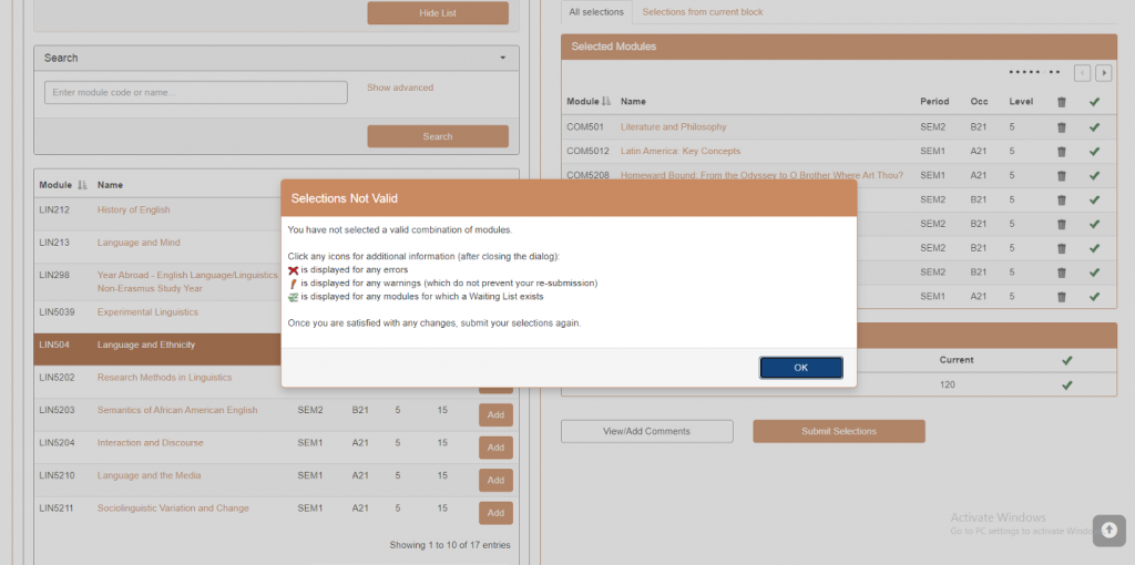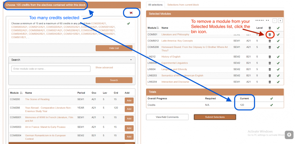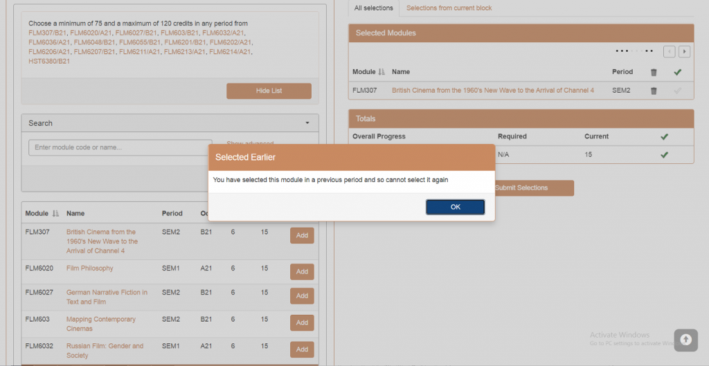 4. Once you reach the maximum number of credits allowed for a particular pot, you are no longer able to add modules from that pot. Note that the same module might be available in different pots, so try to find your preferred module in another appropriate pot.