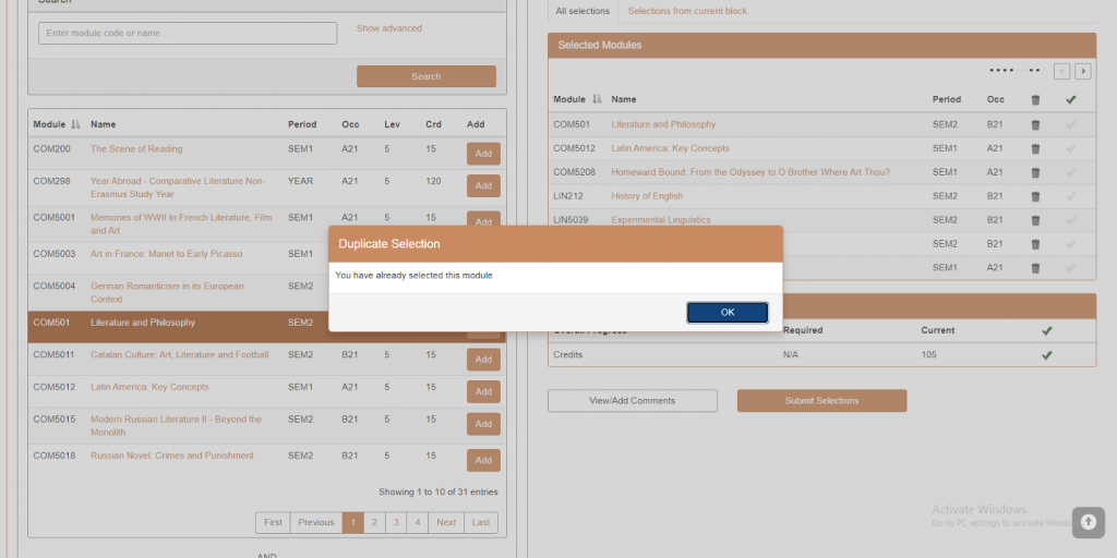1. Adding a module you have already selected will result in a pop-up alert to prevent duplicates. Please select another module from the list.